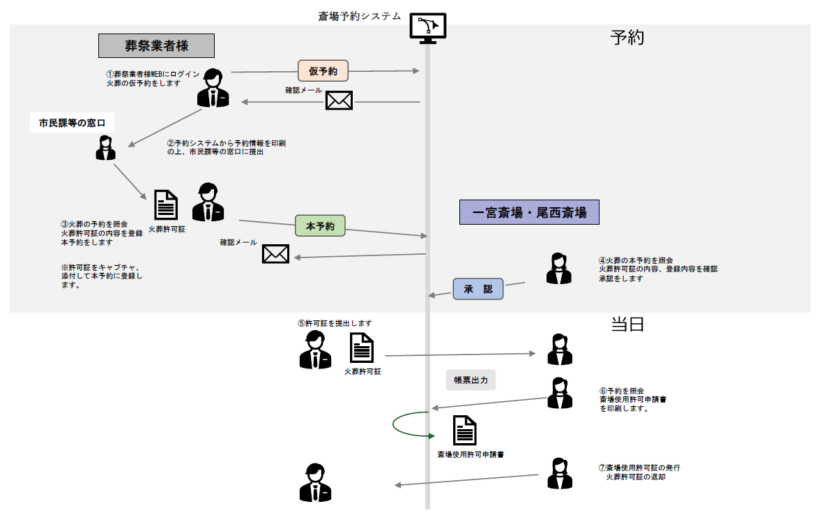 - 個人で予約する場合は一宮斎場に電話予約したうえ、市窓口(※注1)で埋火葬許可の手続きを行ってください。