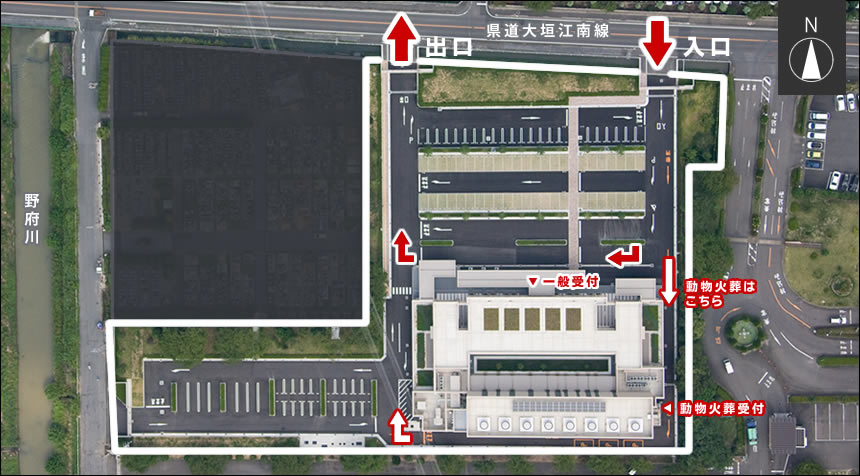 一宮斎場は、一般受付と動物火葬の受付がございます。受付場所が異なりますので、以下の図をご参考下さい。